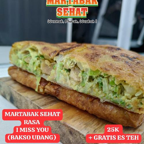 Bakso udang, telur ayam, daun prei, bombai, kentang, acar + cabe ijo, saos, free es teh