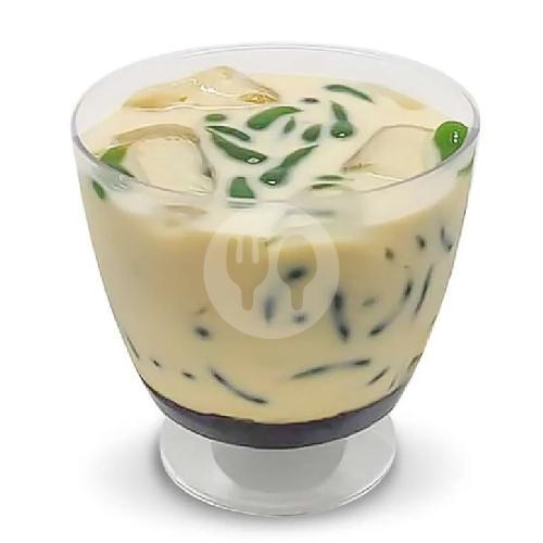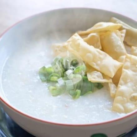 Bubur ayam dimasak dengan kaldu ayam murni disajikan dengan tambahan kripik pangsit, kacang tanah dan taburan daun bawang