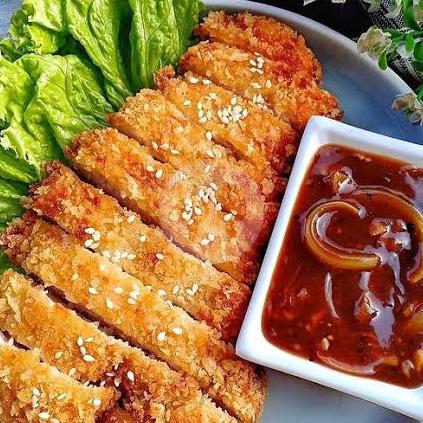 Chicken Katsu Dengan Selada , Timun , Bombay , Dan Saus Hot Lava Khas Bandon No Katsu