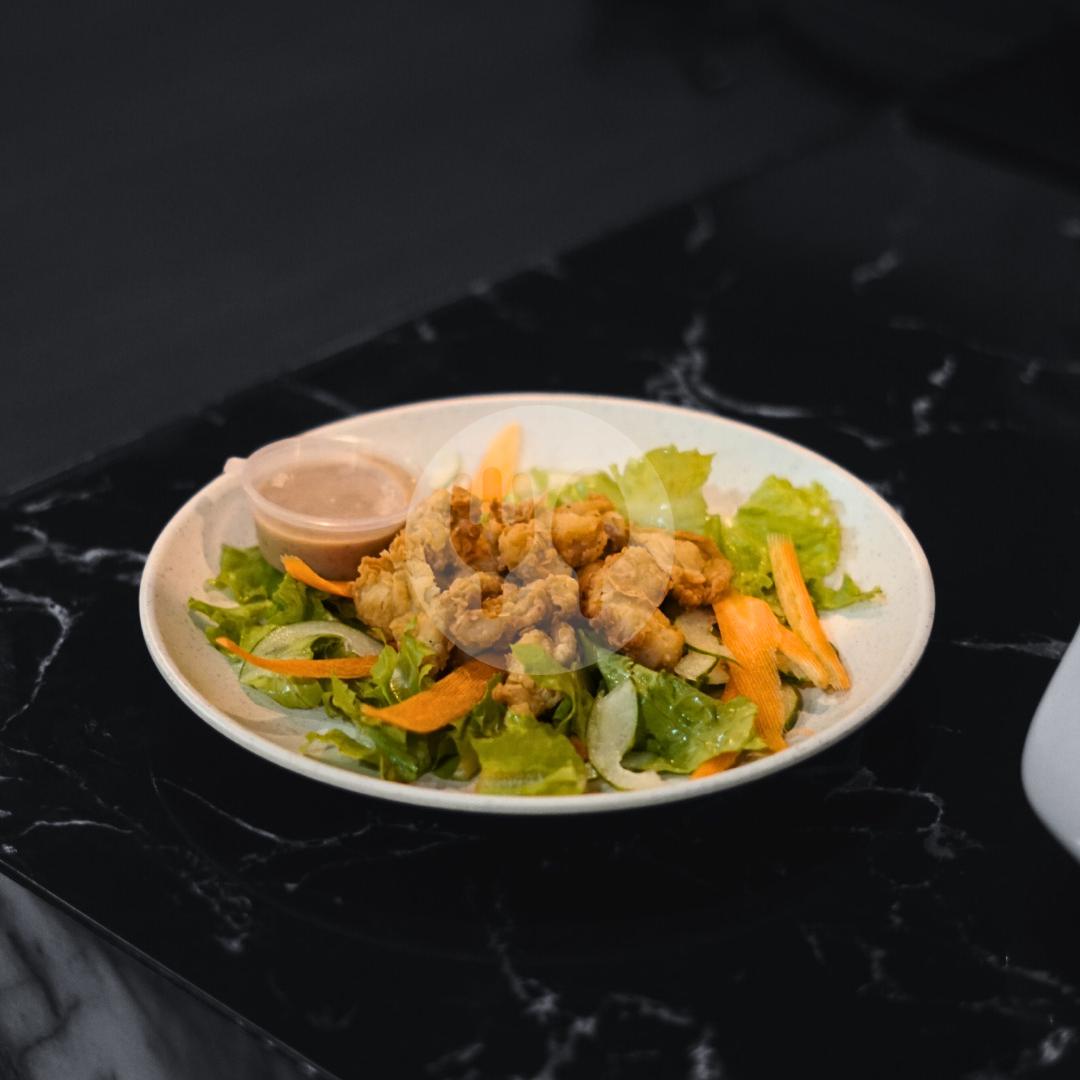 Perpaduan ayam karaage renyah berpadu dengan sayuran segar, disajikan dengan dressing pilihan yang gurih dan menyegarkan. Hidangan seimbang antara protein dan kesegaran, cocok untuk pilihan makan ringan yang tetap lezat dan bergizi.