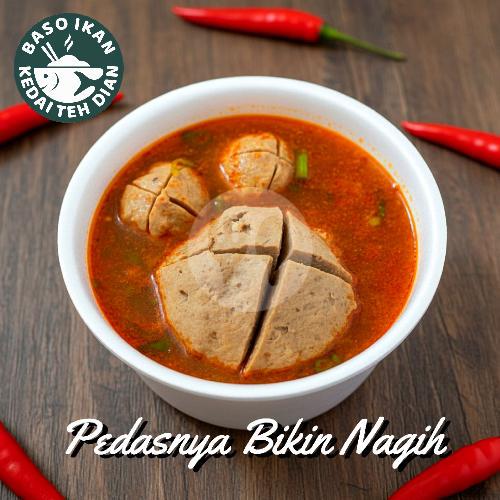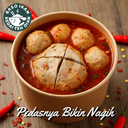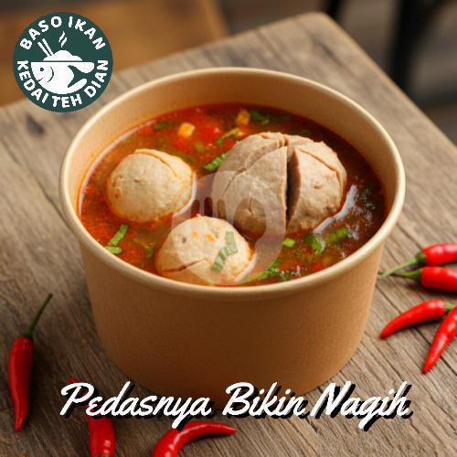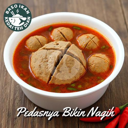 Bakso Ikan Kecil (5 kecil). Bakso ikan kecil, kenyal gurih dalam setiap gigitan yang berkuah hangat. Makin nikmat ditambah sambal chili oil khas Kedai Teh Dian. Kemasan Styrofoam