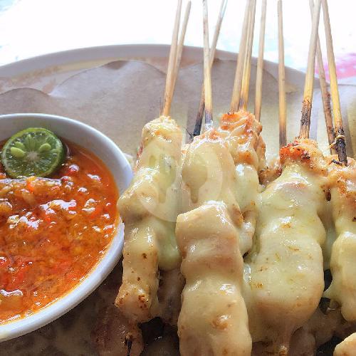 Sate yang menggunakan daging dada ayam yang empuk dan kulit ayam yang renyah dibalur dengan sambal Karai ditambah extra topping keju mozarella dan saos keju