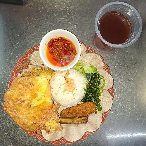 Telur mekar + lalap + tempe + terong goreng + jukut / kol goreng + sambel + nasi + minum