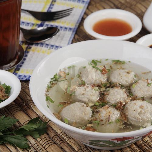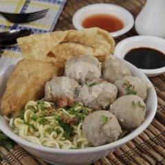 7 bakso halus, 1 pangsit goreng , mie, tahu, seledri, bawang goreng +kuah