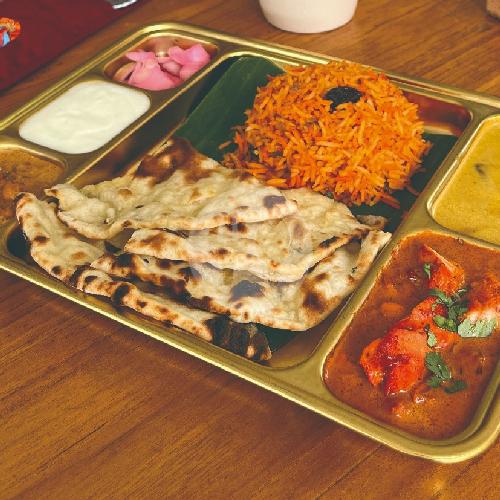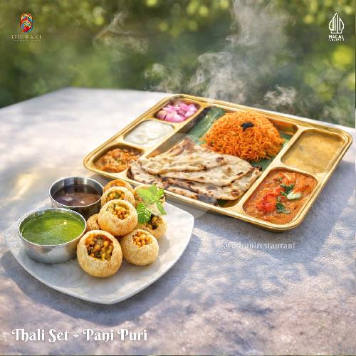 Nikmati kelezatan khas india dalam satu paket lengkap: 1 thali set yang bisa dinikmati oleh vegetarian / non vegetarian, dipadukan dengan 1 porsi snack viral india panipuri.