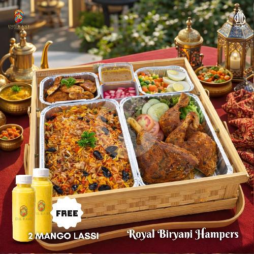 The hamper includes: biryani rice, chicken tikka, chicken tandoori, grilled lamb ribs, boiled eggs, curry gravy, yogurt, and onion pickles (Free: 2 Mango Lassi Greeting Card). The greeting card can be personalized in the notes.