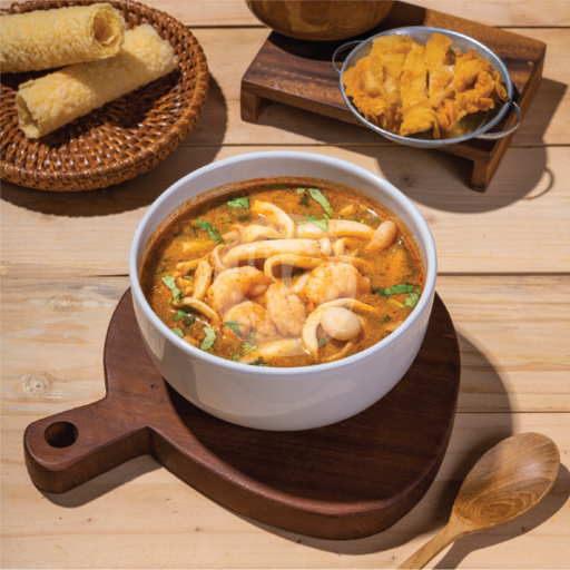 Tom yum dengan rasa asam pedas segar. Protein kombinasi dari udang, cumi, dan ayam goreng.