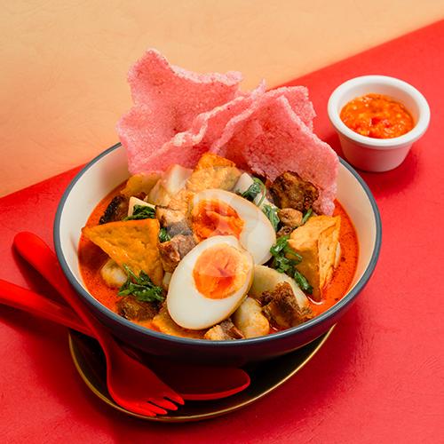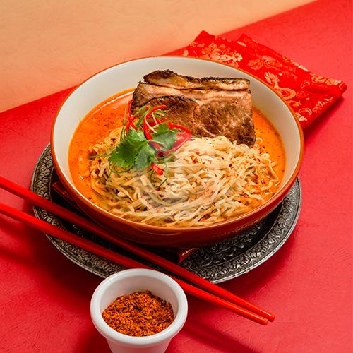 A rich Medan-style curry, layered with warm spices and paired with smoked brisket, homemade duck egg noodles, and fresh coriander