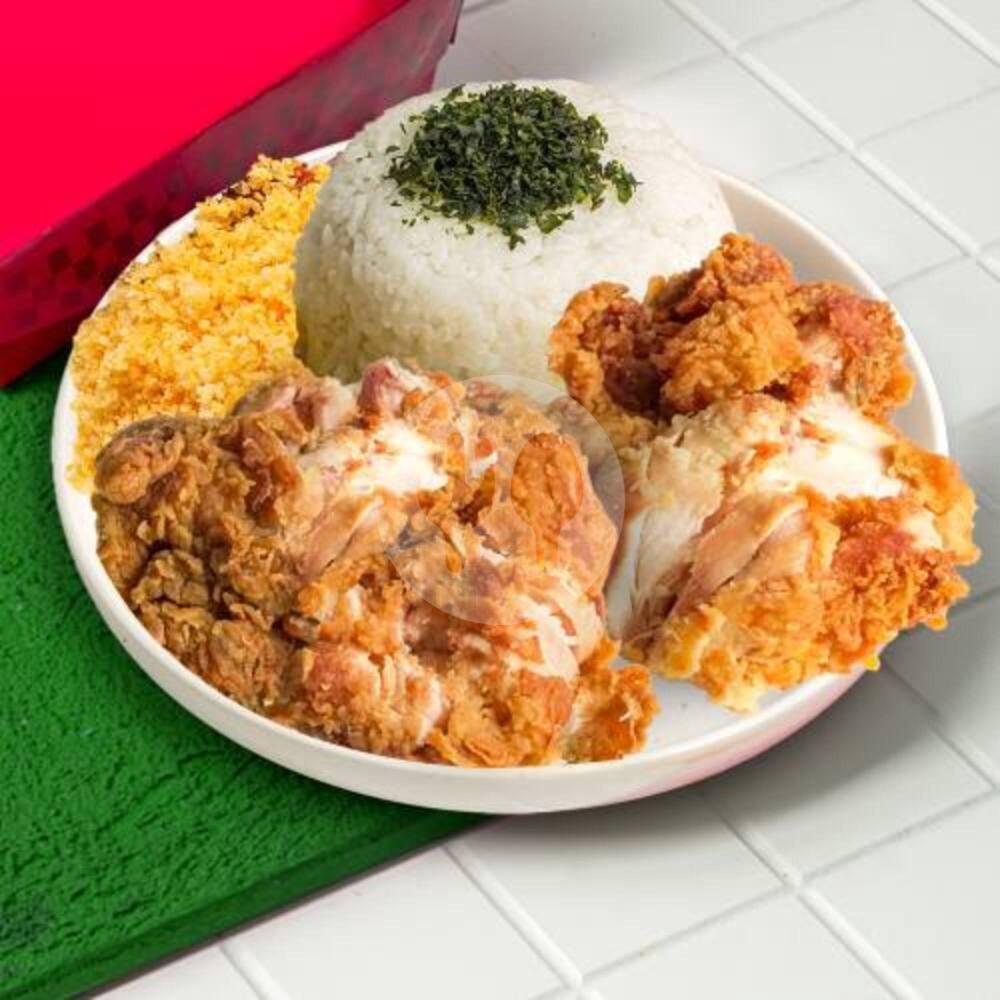 Kenyang Dua Kali Lipat, Nasi + 2 Ayam Geprek + Pilihan Saus/Sambal + Kremes + Crispy Bayam (Tidak Bisa Pilih Dada/Paha)