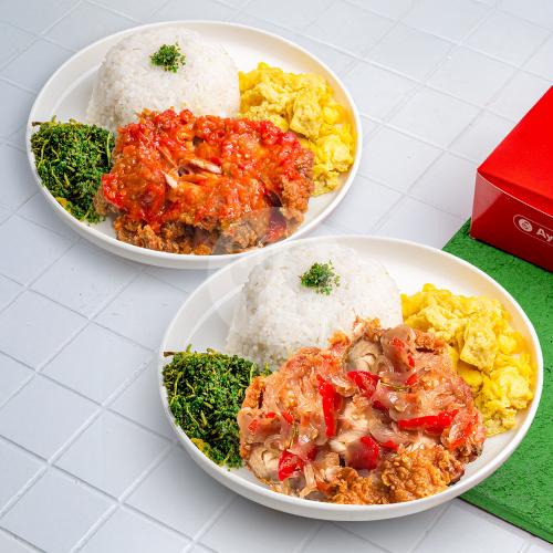 Perpaduan pas, pedes segernya bikin puas. (Pilihan Nasi + Ayam Geprek Sambal Daun Jeruk + Telur + Crispy Bayam/Kremes) & (Pilihan Nasi + Ayam Geprek Sambal Matah + Telur + Crispy Bayam/Kremes)