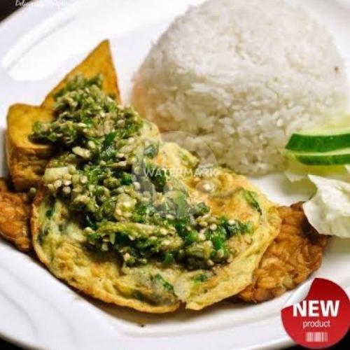 NASI PUTIH + TELOR DADAR BUMBU + TAHU TEMPE GORENG + SERUNDENG KELAPA + LALAPAN + KERUPUK + SAMBAL IJO BUMBU REMPAH SUPER LEZAT MBOK DARMI