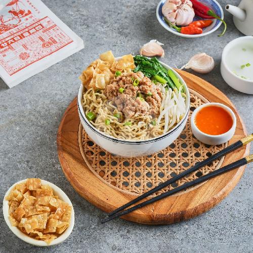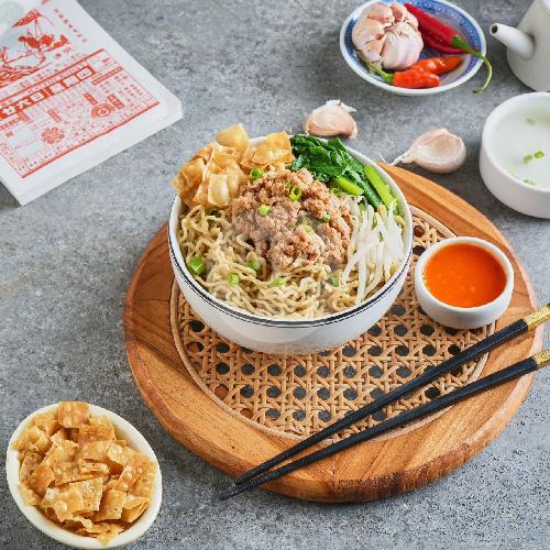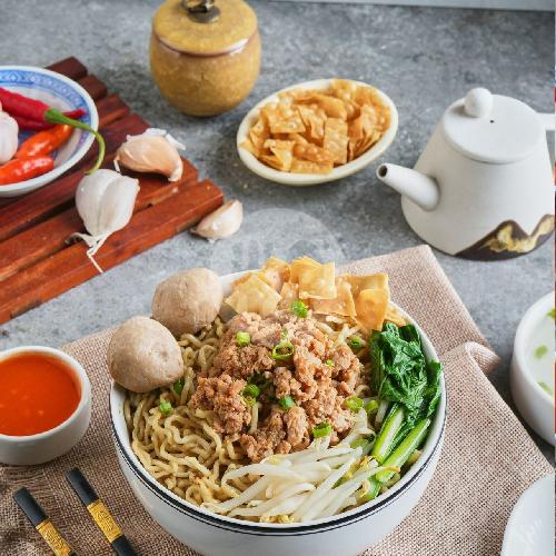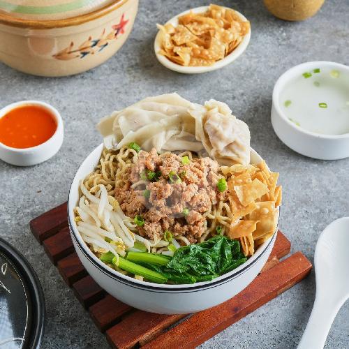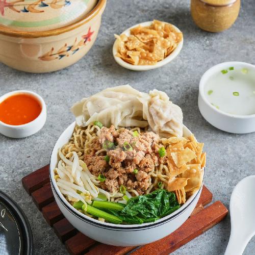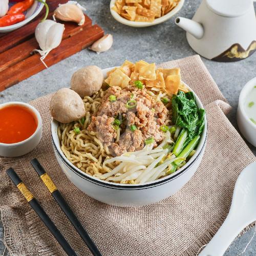 Mie Dengan Topping Ayam, Kecap Manis, Bakso, Pangsit Rebus Dan Pangsit Goreng Mini