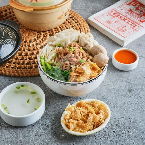 Mie Dengan Topping Ayam, Bakso dan Pangsit Goreng Mini