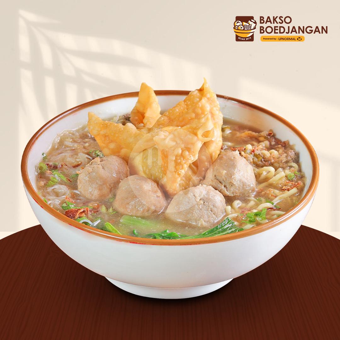 1 bakso besar + 2 bakso pentol + 1 kulit pangsit goreng + mie kuning, bihun & sayur