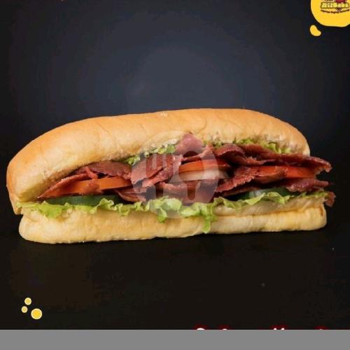 roti hotdog,ditambah daging iris signatur dan sayur lettuce yg segar