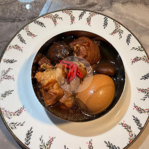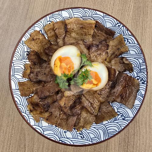Nasi dengan samcan iris tipis manis dengan telur ajitama