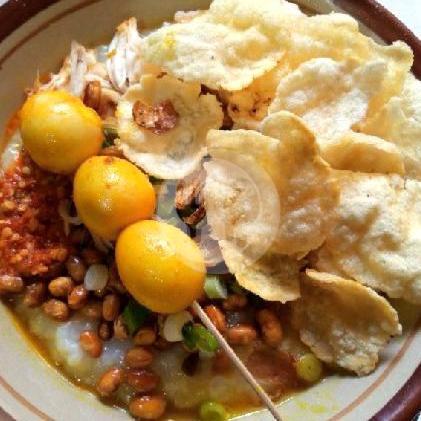 Bubur ayam dengan kuah khas,suwiran ayam,bawang goreng,kacang,seledri,kecap manis,dan kerupuk