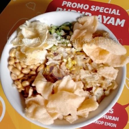 Bubur putih+Kecap+Ayam Suwir+Bawang Daun+Kacang+Bawang Goreng+Mping+Kuah Kuning Dipisah+Krupuk dipisah+Sambal dipisah+Sendok+TERIMAKASIH