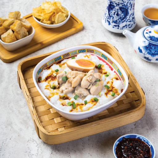 Bubur dengan rasa gurih khas oriental, disajikan dengan ayam hainam klasik, cakwe, dan telur rebus kecap