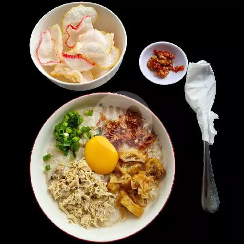 Bubur ayam +telor ayam kampung + Topping Lengkap (Ayam Suwir, Cakwe Crispy, Bawang Goreng, Bawang Daun, Kerupuk, Dan Sambal). Tanpa Kuah, Tidak Menggunakan Vetsin (MSG).