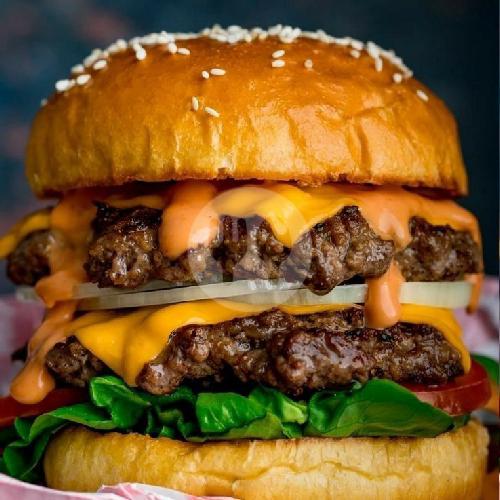 Roti, Daging 2, selada, bombai, keju Slice, saos. (Bisa request tanpa sayur)