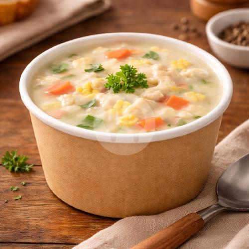 Cream soup gurih manis lezat freshly made by order dengan isian sayuran buncis, wortel, makaroni, sosis dan jamur kuah kental terbuat dari susu dan keju.
