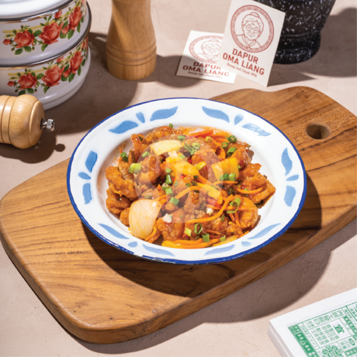Menu paling aman. Ayam goreng renyah dengan saus asam manis segar khas Oma Liang.