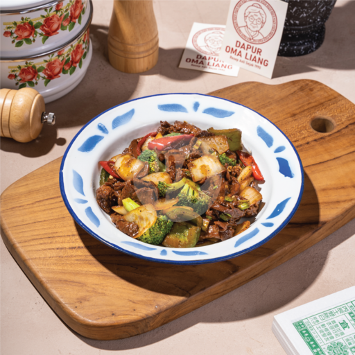 Menu kesayangan saya. Irisan daging sapi lembut dengan brokoli dibalut saus lada hitam pedas gurih khas Oma Liang.