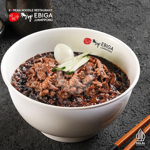 Mie Korea dengan black bean sauce yang smoky, sliced beef, dan telur puyuh.