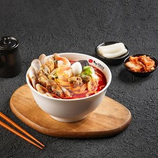 Mie Jjamppong Korea dengan isian udang, telur puyuh, oyster, mushrooms, dan sayuran. Rasanya gurih dan sedikit pedas.
