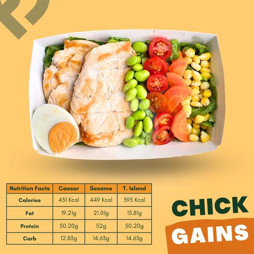Romaine Organik, 2 Porsi Protein Ayam Fit Steak yang dipotong, Telur Omega, Mukimame, Jagung, Tomat Cherry, Wortel, dilengkapi dengan dresssing sesuai pilihanmu.