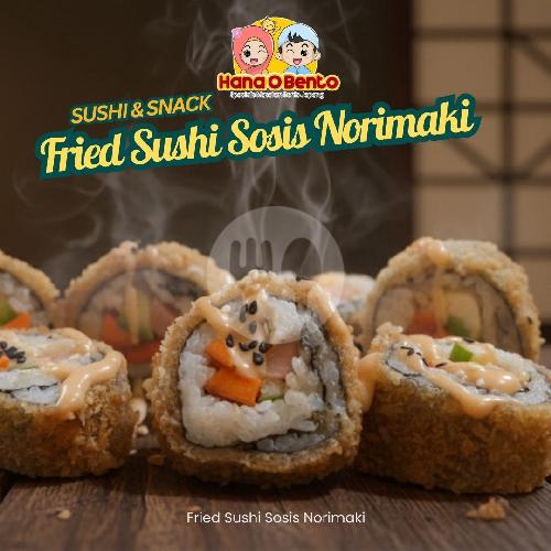 Nasi sushi dengan isian Sosis Ayam khas Hana o bento dengan wortel , mentimun, yang di gulung dengan menggunakan nori rumput laut grade A dengan toping saus mentai, (bonus kecap shoyu). Isi 6-8 potong. Semua bahan menggunakan bahan halal dan thoyib