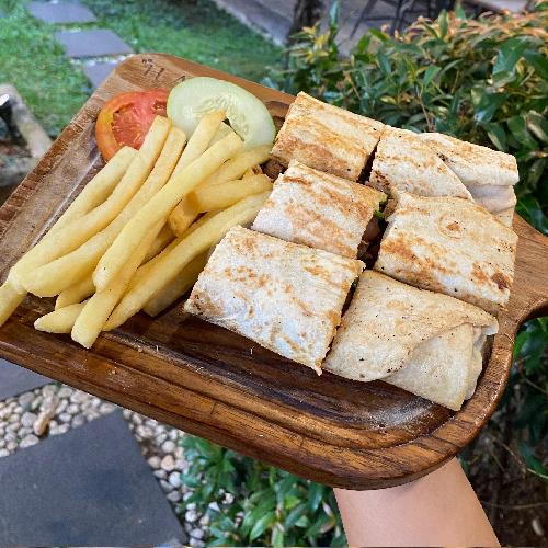 Tortila, Chicken, Selada, Tomato, Garlic Sauce, French Fries