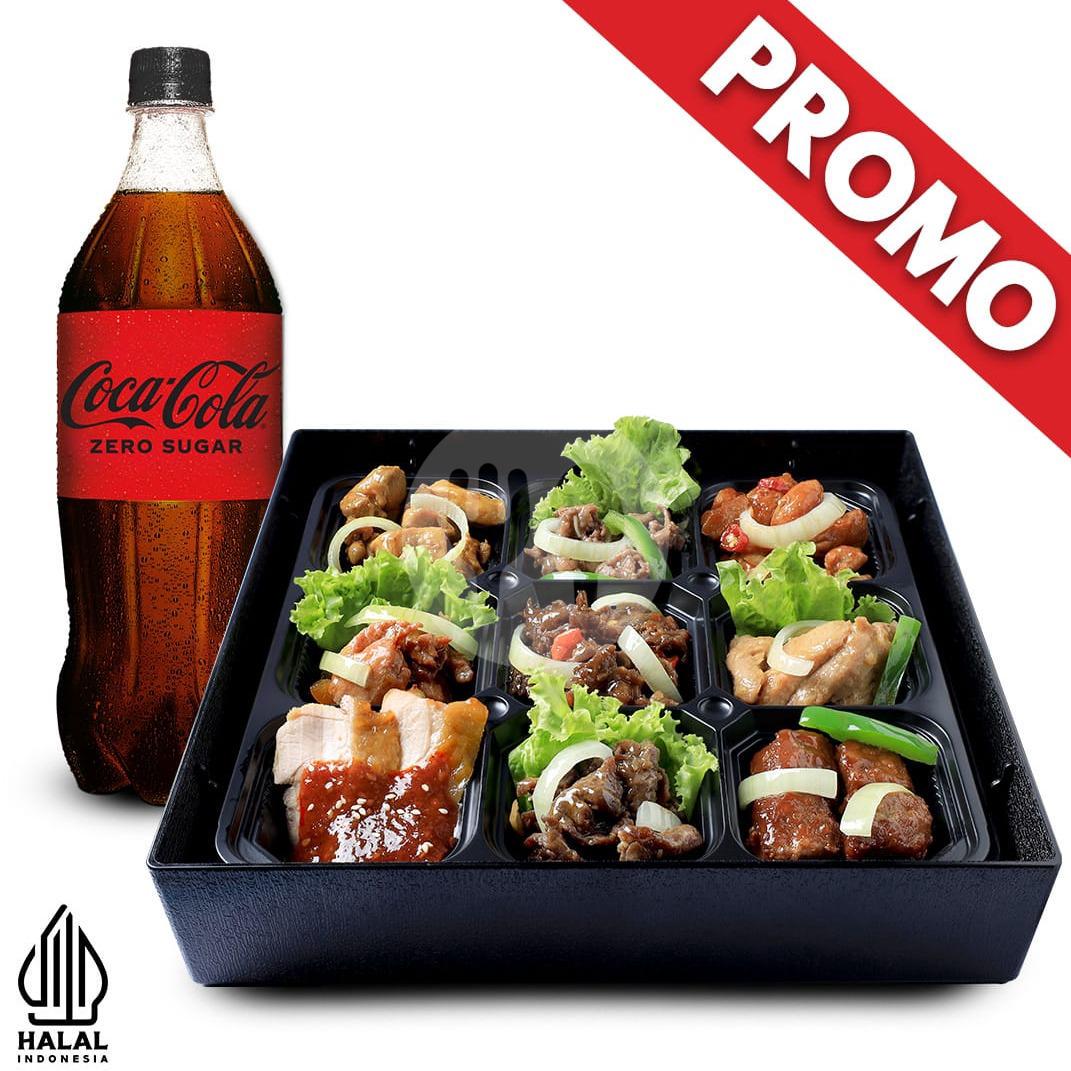 Pilihan Menu Beef & Chicken Favorite dengan cita rasa khas HokBen yang dikemas sebagai Platter dalam 9 sekat kompartemen + Free Coca Cola Zero 1 Liter