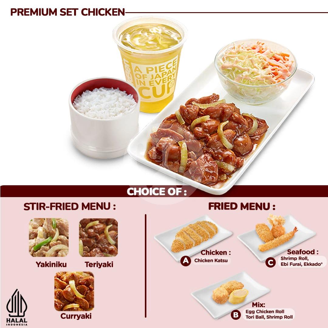 Nasi, acar, 1 pilihan stir-fried menu chicken, 1 pilihan fried menu dan 1 ocha