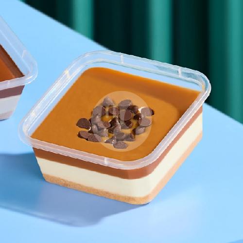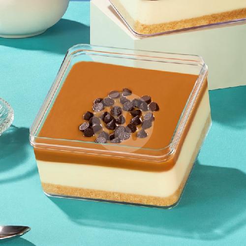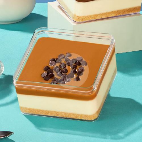 No Bake cheesecake with salted caramel sauce and choco chips, 9 x 9 x 3 cm