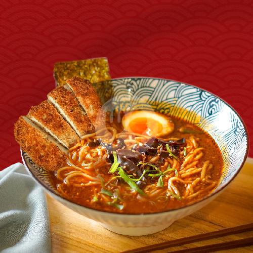 Ramen dengan bumbu rempah-rempah pedas khas Asia. Perpaduan tekstur mie yang lembut, chicken katsu, ajitama egg, nori, jamur, daun bawang dan wijen. (Taste : pedas dan gurih)