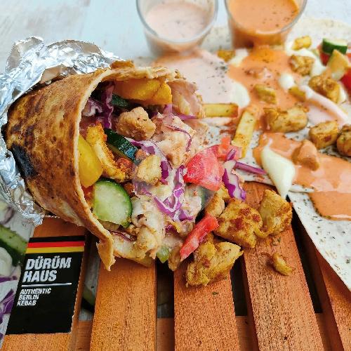 Porsi kenyang mantab. bukan cemilan. Tortilla gandum ukuran xxl dengan isian: irisan daging ayam asli 150gr, kentang goreng, saus special durumhaus (berlin-germany style) dan sayuran seasonal pilihan. Durumhaus, lecker healthy halal.