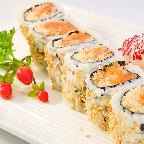 Nasi Sushi,Nori + Wijen Putih Di Roll Dengan Spicy Salmon Smoked , Abon Tanuki Dan Spicy Mayo