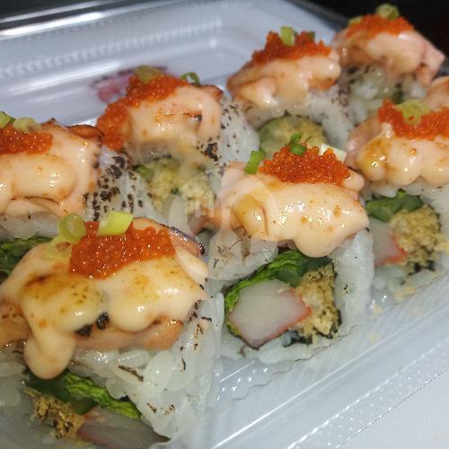 Sushi Roll Dengan Isi Kani Stick, Sayuran, Crunchy Dengan Toping Salmon Matang Yang Dibakar Dengan Saus Spesial Mentai