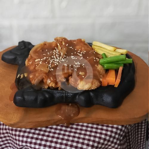 Ayam Berbalut Tepung, Crispy Di Luar Lembut Di Dalam, Di Lengkapi Dengan Kentang Goreng, Wortel Dan Buncis, lalu Di Siram Dengan Saus Steak Yang Lezat