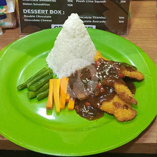 Nasi, Chicken Katsu, wortel, Buncis Di Tambah Dengan saus blackpepper Yang Pas Pedas Nya