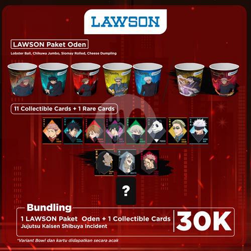1 Paket oden dengan bowl Jujutsu Kaisen (random design) berisi lobster ball, chikuwa jumbo, siomay rolled, cheese dumpling, plus 1 collectible card (blind pack)