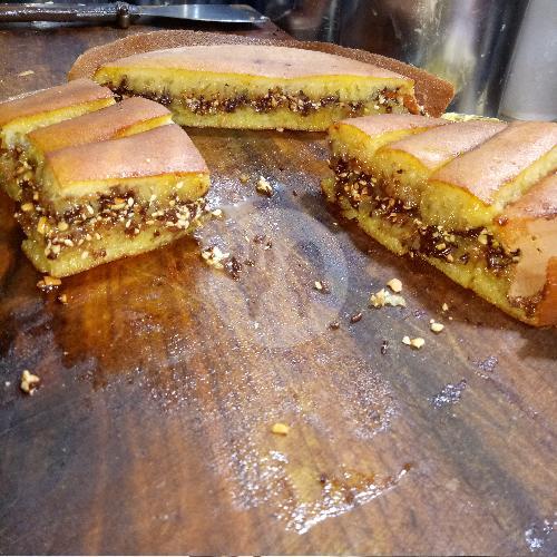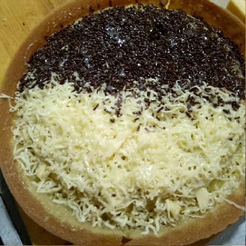 Toping parudan keju yang ditaburi meses plus susu kental manis.
