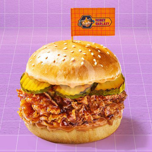 Burger dengan potato bun yang lembut, paha ayam crispy tanpa tulang, saus creamy, dengan pilihan Flavors of the Galaxy