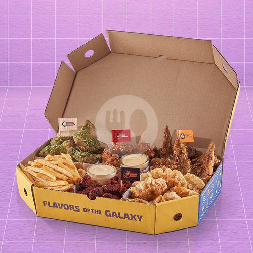 (untuk sharing) 10pcs Korean Chicken Wings + 10 Mandu Goreng + 2 porsi Pop Corn Chicken (Boneless) + 2 Kentang Goreng + 2 Toppings