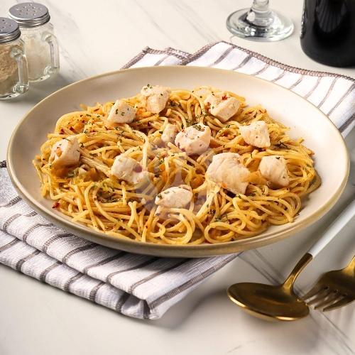 Aglio e olio kami yang elegan menampilkan bawang putih segar yang ditumis sempurna, ditambah dengan sedikit cabai kering dan disempurnakan dengan daun parsley. Pilih pasta favorit anda (spaghetti / fettuccine) dan protein