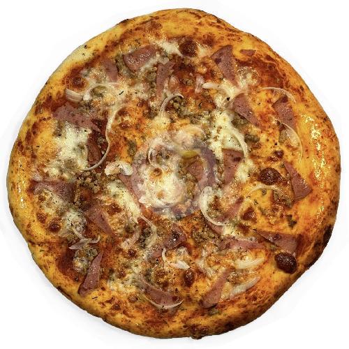 Pizza Dengan Tomato Sauce, Mozzarella Cheese, Meat Chunk, Smoked Beef, Onion Dan Mix Herbs. Diameter Pizza 33cm Dipotong 8.