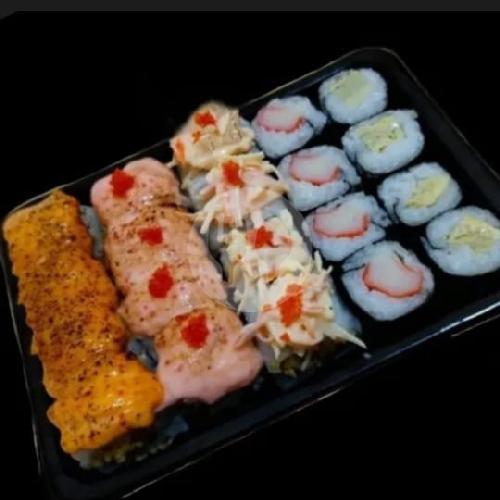 Spicy salmon roll 4pcs, salmon mentai roll 4pcs, kani mentai roll 4pcs, kani maki 4pcs, tamago maki 4pcs.