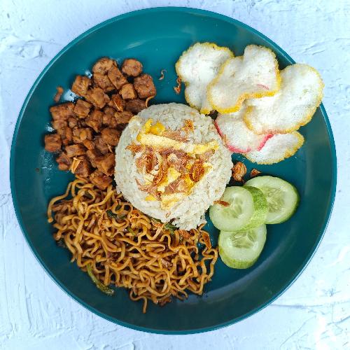 Nasi Uduk Dengan Cita Rasa Gurih Yang Disajikan Dalam Satu Piring Bersama Telur Iris, Mie Goreng, Tempe Orek,Serta Taburan Bawang Goreng Diatasnya